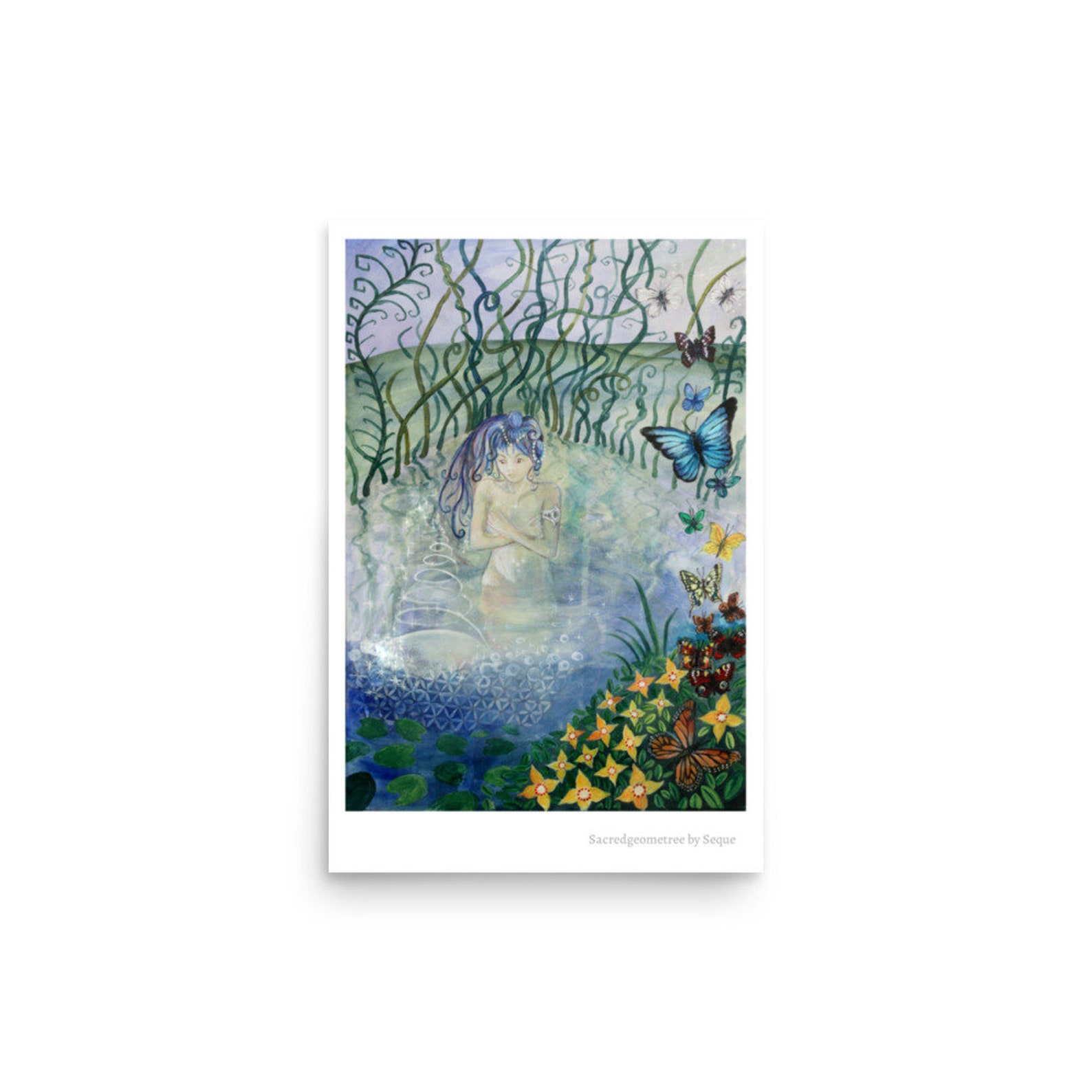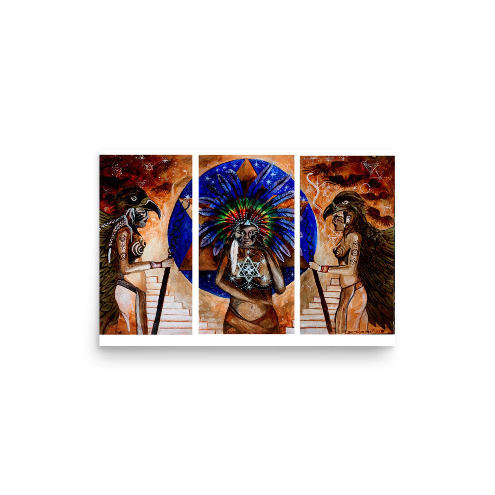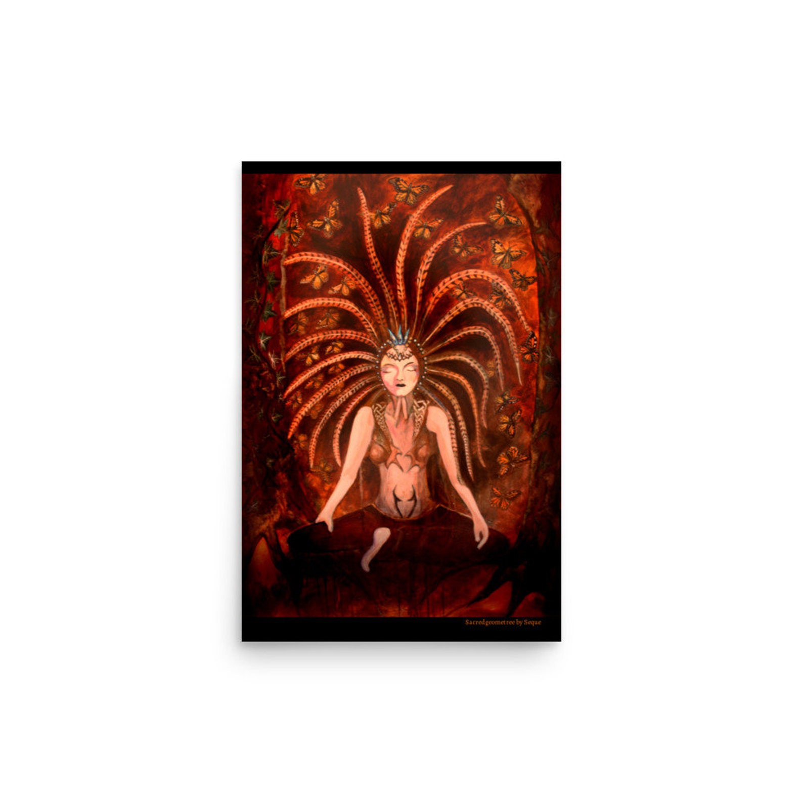 This Piece is called the Waters of Life and was inspired by the plants, Butterflies and a Sacred Spring fed Lake in the Amazon Jungle. Water runs through all that is alive, it feels our prayer and vibration which is a reminder to be in and connected to nature doing what we love. This Piece is called the Butterfly Priestess and was inspired by the beauty of nature in England and Mexico. She came in a vision around being a sovereign being. Deeply Connected to Mother Earth through her body and her pheasant feather headdress reaching out, connecting to the spirits of the forest. The transformation magic of the monarch butterfly reminds us to reconnect to Mother Earth in our Sacred Prayer. This Piece is called Sacred Fire. The piece was inspired by a fire ceremony where the dancing flames danced into the vision of the flower of life sacred geometry. And a later fire ceremony, really learning with the element of fire in the woods. A tawny owl flew so close over me and the embers as the ritual was finishing. Fire is the element that transforms and brings us deeply into trust so we choose connection that brings the dance of sacred fire. This Piece is called Star Priestess. This Rainbow Goddess, Star-being burst through the clouds to me in the Yucatan Peninsula of Mexico, It was the first time I experienced anything so vivid and real from the spirit world. She continues to guide me deeply on my Spiritual Journey. These beings teach of the importance of the vibrational fields of geometries in healing. The ancient connection of the priestesses, Goddesses, all supporting us to remember who we really are and these Sacred Arts. Perhaps you would love to have this piece in your Sacred Space.